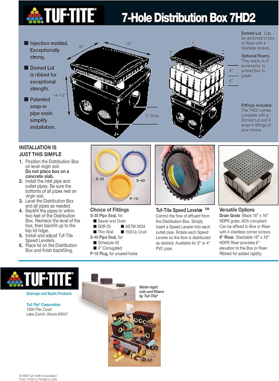 7HD2 7-Hole Distribution Box. Comes complete with a lid. Lid is 16" x 16"; Box is 14-1/2" tall; There is a 2" drop between inlet and outlets.