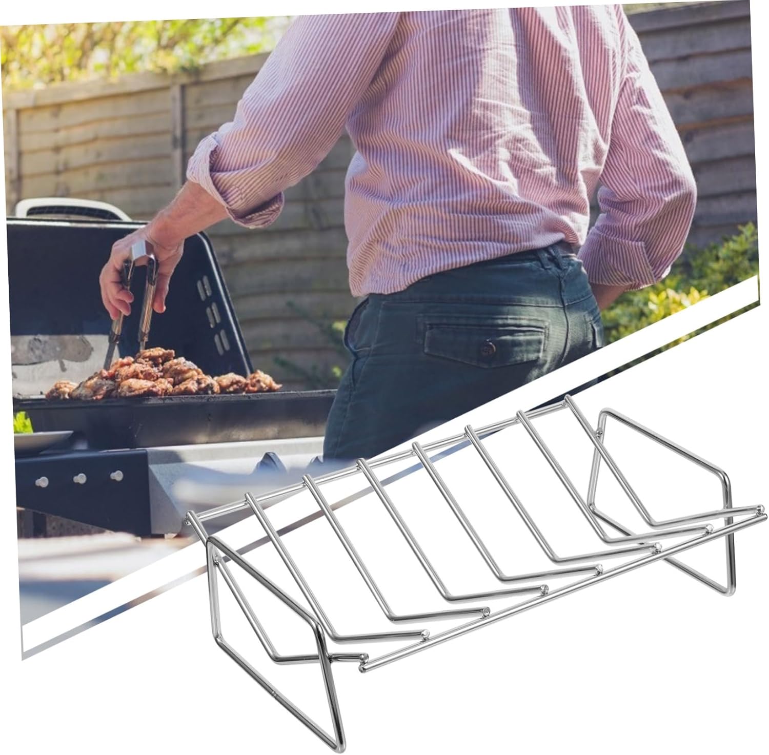 Package Include 1 x Rib Rack Characteristics - Size: About 27.00X17.50X8.50cm/10.61X6.88X3.34in Barbecue Rack. - Color: Silver Barbecue Accessories. - Material: Stainless steel Portable Rib Rack. - This smoking rack is solid construction, made out of thick and sturdy stainless steel, durability Barbecue Rib Rack. - When use the rack US a roast can holds Thanksgiving or holiday turkey, chicken or up out of its juices for an even, all-around Stainless Steel Rib Rack. - The material enjoys the strong durability, not easy to deform or break Barbecue Tool. - Stack and cook your ribs to perfection with the non-stick rib rack for barbecue grilling and smoking use Stainless Steel Rib Grill. - Suitable for outing barbecue activities, perfect for slow cooking Outdoor Grill Rack.Goods DescriptionBarbecue Grill Wonderful barbecue grill for outdoor use.Barbecue Tool This barbecue rib rack is made of good stainless steel material, high durability, extremely durable and super practical.Camping Rib Rack Perfect for family garden party, picnic, camping use.Barbecue is portable design, so it can be carried where you want to camp